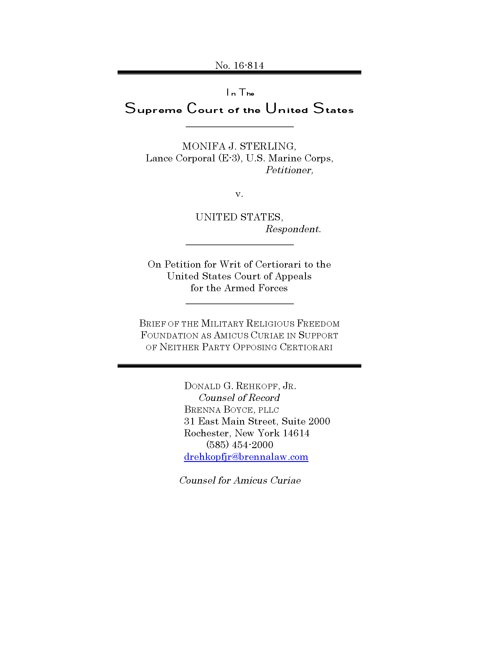 The MRFF filed a “friend of the Court” Brief today at the Supreme Court of the United States opposing former Marine Corps Lance Corporal Sterling’s request to have that Court review her conviction for violating the direct orders of her military supervisor, a U.S. Marine Corps Staff Sergeant. MRFF did this because Sterling’s request first distorts the facts of her numerous convictions. For example, in the conviction at issue, she claims that she was illegally ordered to remove signs that she had made and posted around her desk in a common work-area at her USMC Base, which allegedly were Bible verses. The language in the three signs is not from any recognized, English-language Bible.