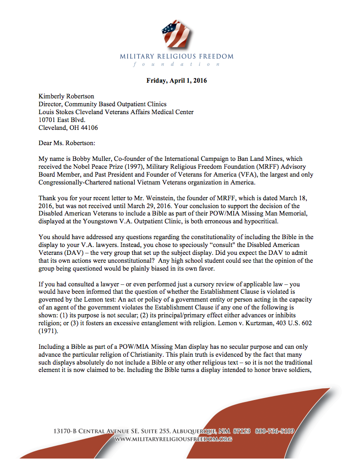 MRFF ADVISORY BOARD MEMBER BOBBY MULLER RESPONDS TO VA's KIMBERLY ROBERTSON,