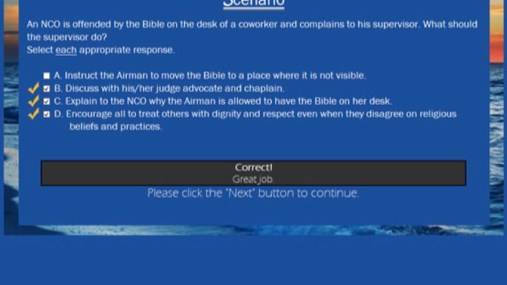 Slide below is from a mandatory U.S. Air Force "Freedom of Religion" training exercise, held every 2 years. The training exercise covers the topic of displaying a bible on the desk of an NCO, but not on the desk of a senior ranking officer. The three checkmarks in the photo are the approved answers according to the U.S. Air Force.