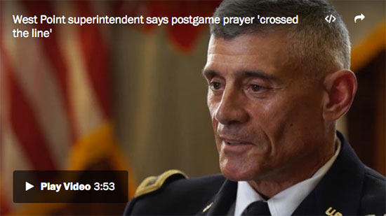 The issue emerged after Coach Jeff Monken was shown in a video produced by West Point celebrating with his players and directing a member of his staff to lead a prayer after an upset victory Sept. 2 over Temple University. The video was taken down at the direction of Athletic Director Boo Corrigan after West Point received complaints because it was offensive to some people and leaving it online would have been "like grinding salt into the wound," said Lt. Gen. Robert L. Caslen, the superintendent at West Point.