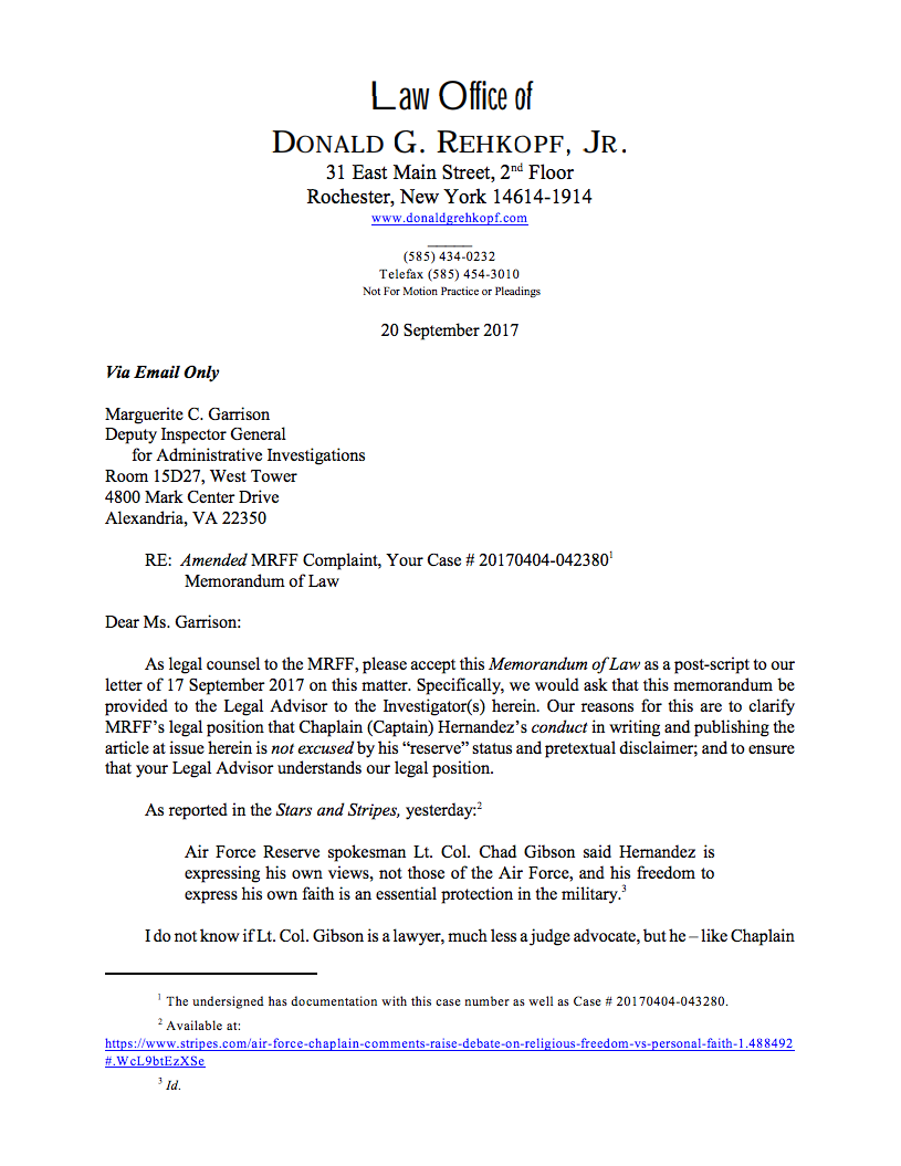 According to a highly misleading September 19 article from Stars and Stripes, the Air Force is not conducting an investigation into Captain Sonny Hernandez, the Air Force Reserve chaplain whose September 12 article on barbwire.com, titled "Christian Service Members: Avoid Supporting or Accommodating Evil!," in which Chaplain Hernandez publicly proclaimed that Christians in the military who support the constitutional rights of service members to practice other religions "serve Satan."