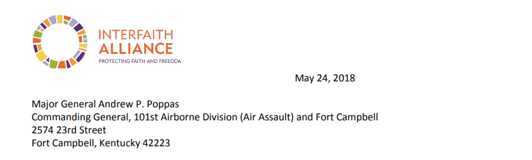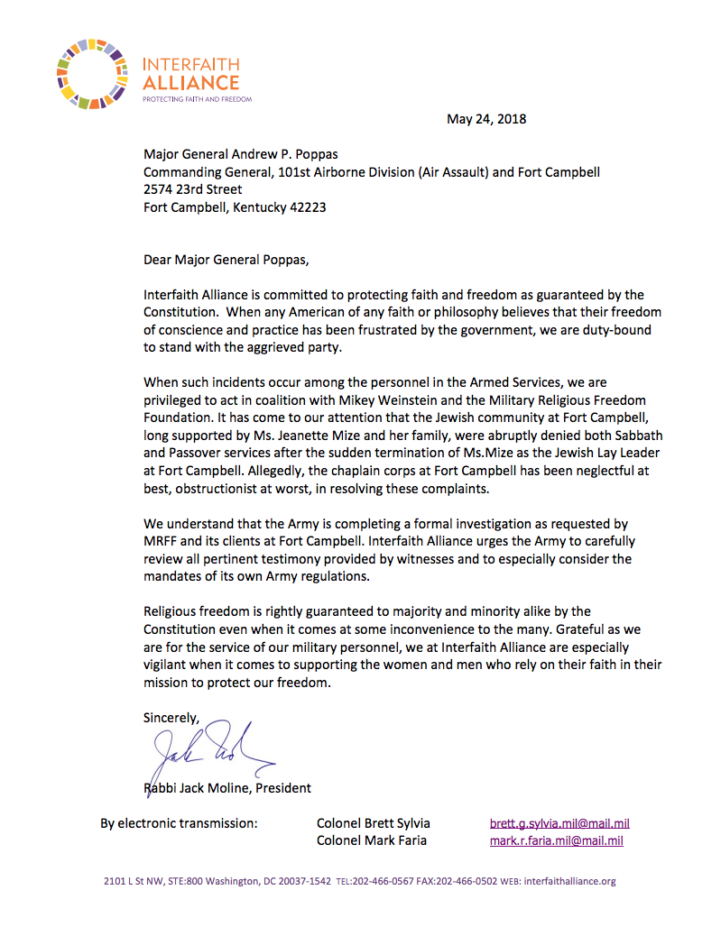 Sends Letter To Ft. Campbell Leadership Condemning Dismissal of Jewish Lay Leader (click here to enlarge letter)