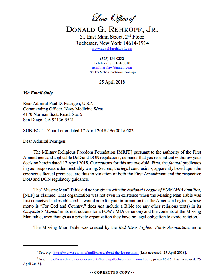 "As one of nine symbolic references on the table, the purpose of the book and accompanying description is not to promote religion, but to commemorate the strength and resolve required of POW and MIA personnel in the most difficult of times. Each item on the table contributes to an atmosphere of remembrance and solemnity, without emphasizing the book as a religious text," explained Navy Medicine West spokeswoman Regena E. Kowitz in an email to The San Diego Union-Tribune.