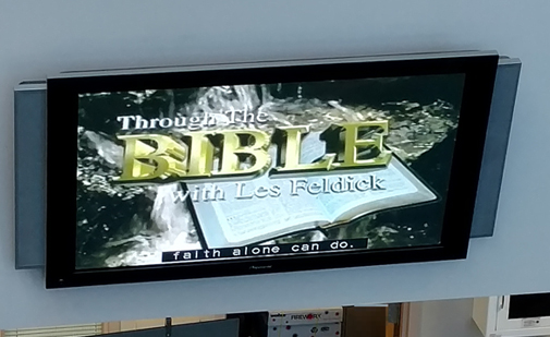 I looked up the program after the fact and it was "Through the Bible with Les Feldick". The website for this program says it is "available on cable TV(ION), satellite TV (including DIRECTV and Dish Network), local TV", etc. I don't know and could not tell at a glance which premium TV service JBLM prefers and used to stream its religious education programming this morning, but a quick look through some online schedules shows me no particular reason why the television should have been tuned to ANY of these stations at 0730-0830 in the morning unless it was specifically to watch "Through the Bible with Les Feldick".