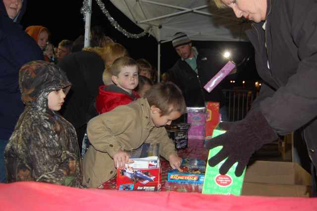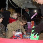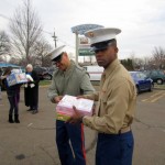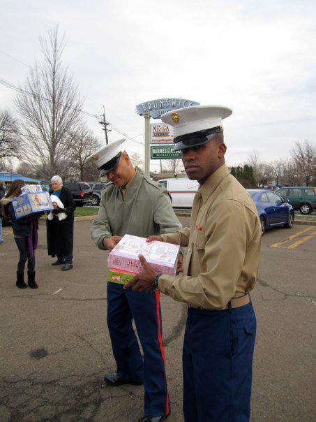 A couple of Marines from Toys for Tots stop by to lend a hand: