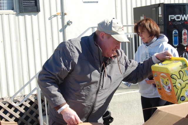 Now, it just so happens that the Baas family, MRFF’s clients who wouldn’t be spending the holidays with their own daughter because the Cadets for Christ cult at the Air Force Academy have ripped apart their family, happen to live in Gulfport. So, even though they wouldn’t have their own daughter home for Christmas, Peter and Jean Baas volunteered on the receiving end, helping to unpack and give out the toys, the final step in the crazy plan to bring some joy to kids in Mississippi from their friends in New Jersey.