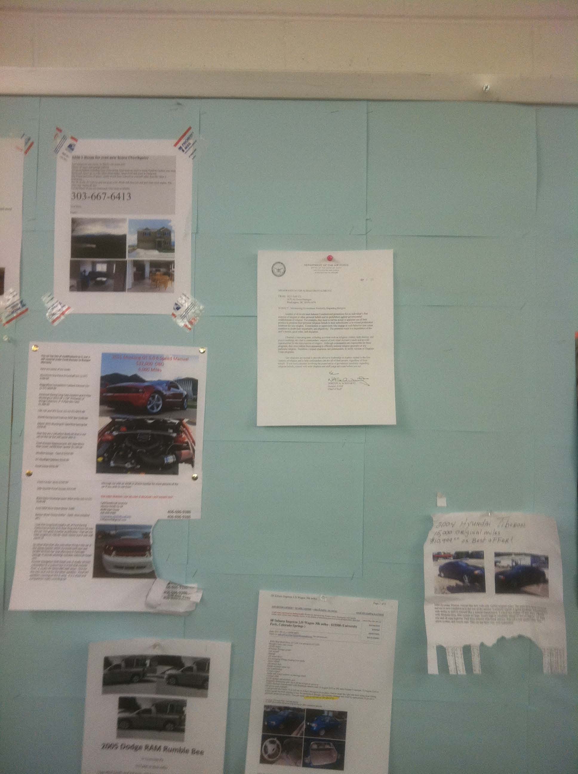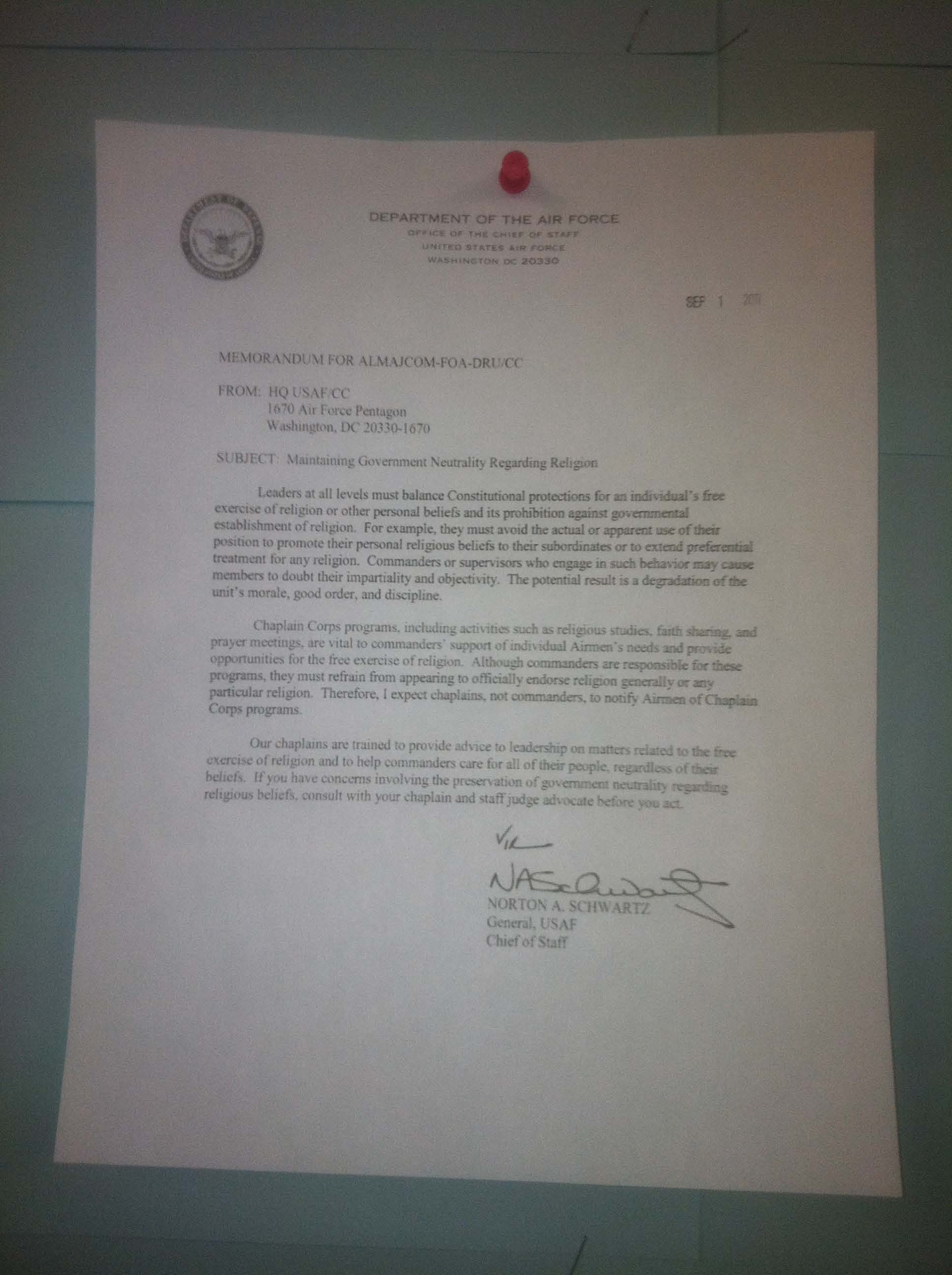 This post was created on the previous version of the MRFF website, and may not be fully accessible to users of assistive technology. If you need help accessing this content, please reach out via email.I’m (USAF Academy Contractor’s name withheld). I work at the USAFA as a contractor in Vandenberg Hall. I wanted to share a couple of photos of the cadet bulletin board that is located across the hall from the post office. The memo was printed out and put on the bulletin board that the cadets use for advertising cars they want to sell, concert promotions at Arnold Hall and any other thing they want.
