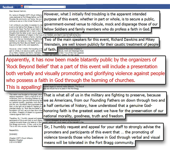 FORT BRAGG, NC – Chaplain (Captain) Chuck Williams wrote an open letter on Fort Bragg’s Facebook page calling for the cancellation of on-post secular festival Rock Beyond Belief. Cpt. Williams claims, “It has now been made blatantly public by [event] organizers that part of this event will be… glorifying violence against people who possess a faith in God through the burning of churches. This is appalling!”