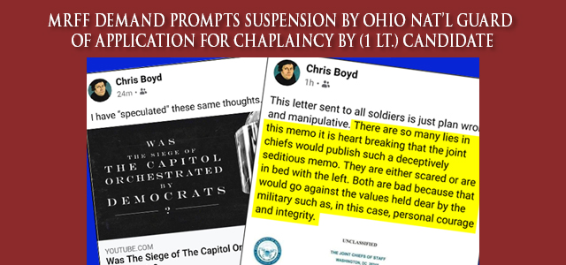 2/1/21 – MRFF’s Demand Prompts Suspension by Ohio Nat’l Guard of Application for Chaplaincy by Candidate Who Accused Joint Chiefs of Sedition