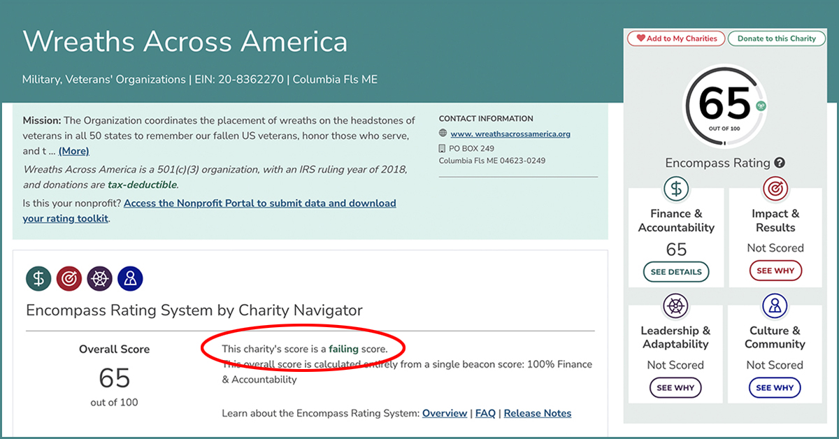 “Wreaths Across America” Gets a FAILING GRADE on its Finances from Charity Navigator; MRFF Passes with Flying Colors!