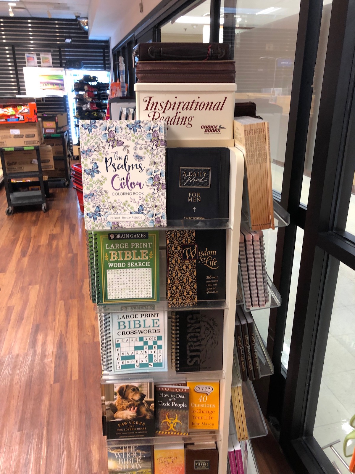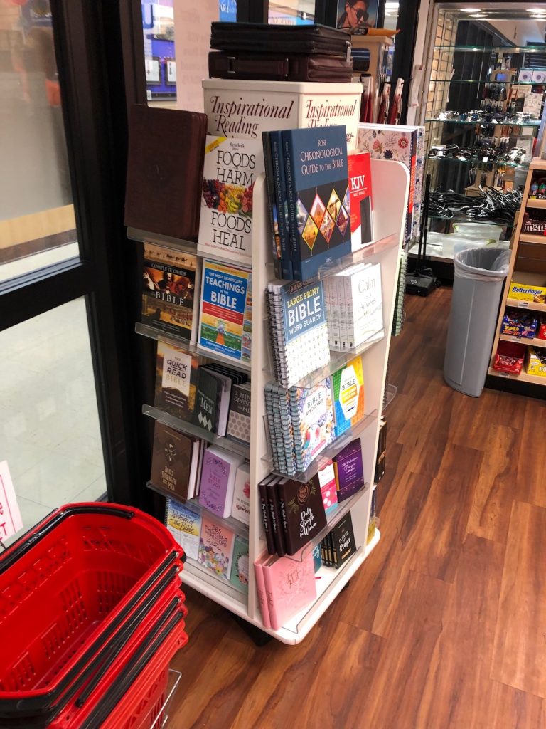 As you can see, the rack is labeled “Inspirational Reading” and includes ONLY, and exclusively, Christian books, including one titled “Proverbs for Dogs.”