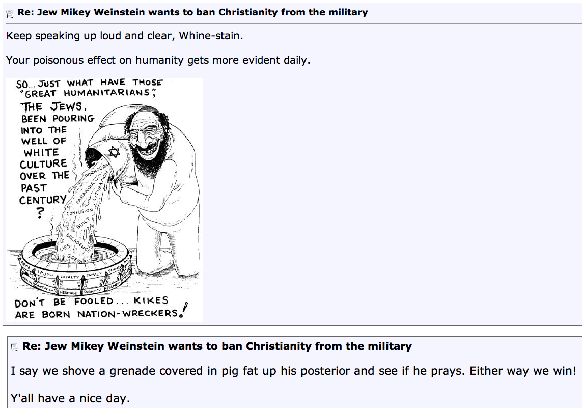 - This was posted to Stormfront, a white nationalist and supremacist neo-Nazi internet forum, and subsequently forwarded to MRFF: