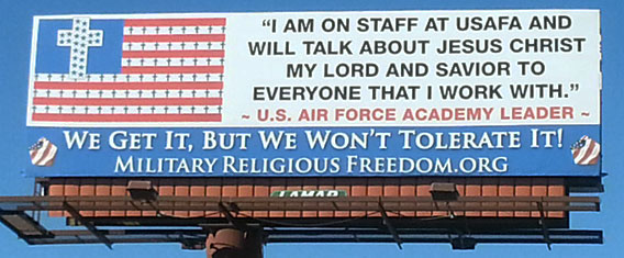 (COLORADO SPRINGS) The brazen assertion by a leader at the United States Air Force Academy (USAFA) that he WILL proselytize to "everyone that I work with" at the Academy, and the Academy's stunning, baseless defense of this individual, has provoked the latest barrage from the Military Religious Freedom Foundation (MRFF). The organization has posted a billboard at the doorstep of the Academy in Colorado Springs, the second one this month alone, and the third one posted in the city in 2013.