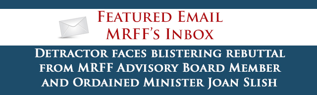 The Military Religious Freedom Foundation (MRFF) does receive a lot of hate mail, but in all of my years being on the Advisory Board of MRFF, I have never read a more despicable email such as yours. You cloak your vile, bigoted, anti-Semitic, holocaust-illiterate rant with the love of Jesus, which you fail miserably at.