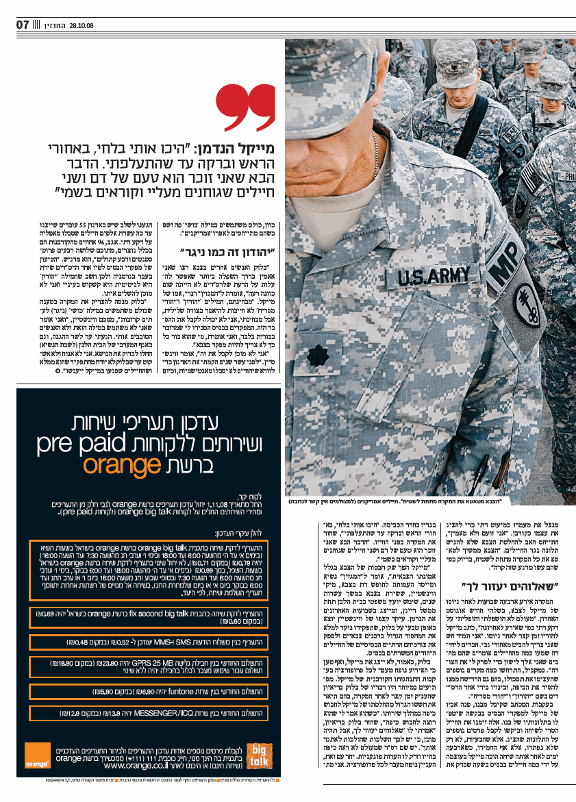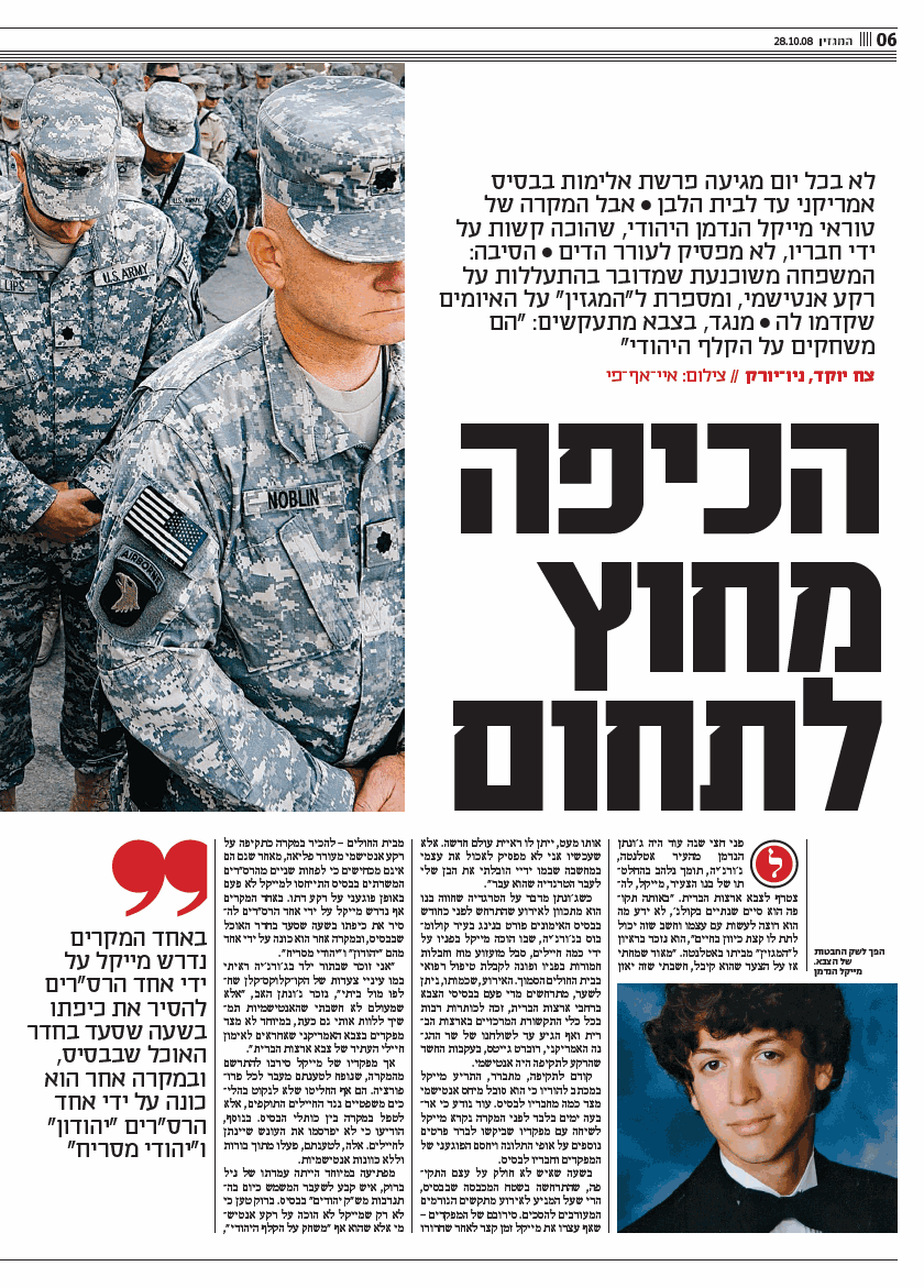 When Jonathan speaks about the tragedy that his son experienced, it means the incidents that took place about a month ago at the Fort Benning training base in Columbus, Georgia, in which Michael was struck in the face by several soldiers, suffered a concussion and severe injuries to his face and he was transported to receive medical attention at the nearby hospital. The incident, like which, it can be presumed, a few take place occasionally on Army bases across the United States, received headlines on all the mainstream media in the United States and even reached the table of the American Secretary of Defense, Robert Gates, as a result of the suspicion that the background for the attack was anti-Semitic.